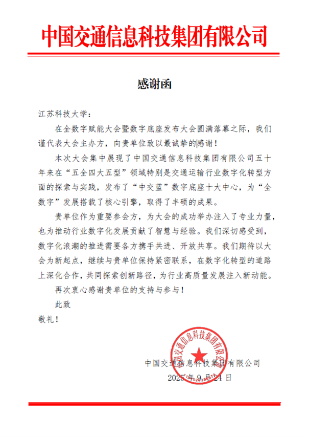 近日,我们收到中国交通信息科技集团有限公司发来的《感谢函》,衷心感谢学校作为全数字赋能大会暨数字底座发布会重要参会方,为大会成功举办提供的专业支持,以及在推动行业数字化发展方面所做出的积极贡献。感谢函中提到,站在新起点,希望双方保持紧密联系,在数字化转型的道路上深化合作,共同探索创新路径,为行业高质量发展注入新动能。